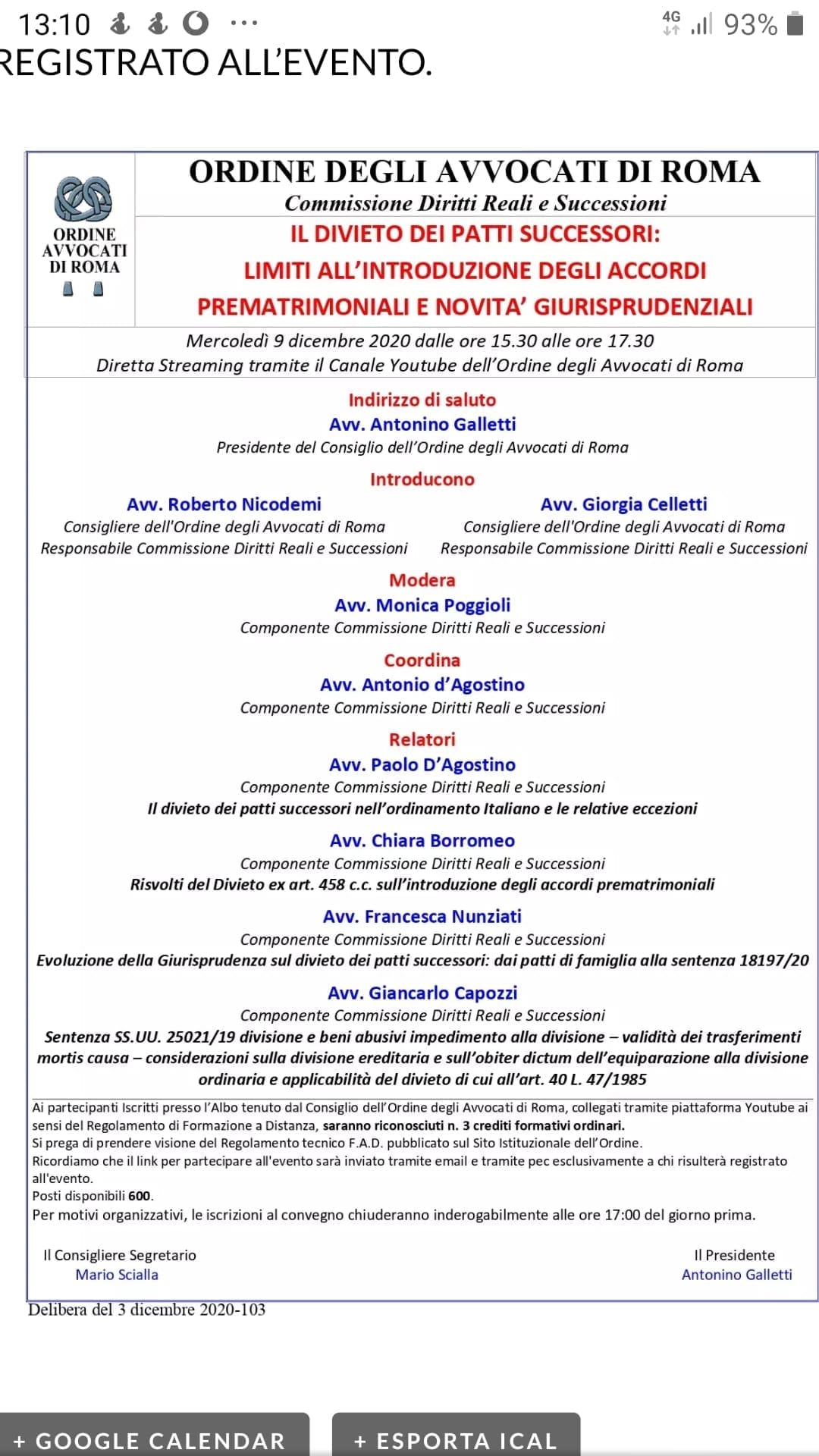 Infine, sono attivamente coinvolto con il Consiglio dell’Ordine degli Avvocati di Roma, in particolare nella commissione studi in materia di Successioni e Donazioni. La mia partecipazione come moderatore e relatore per l’aggiornamento deontologico obbligatorio evidenzia il mio impegno nell’essere sempre aggiornato sulle ultime novità legislative e deontologiche.